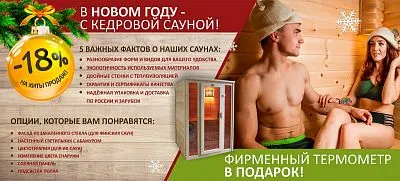 *Скидка 19% действует на все финские и инфракрасные сауны с керамическими нагревателями, скидка 9% действует на все инфракрасные сауны с карбоновыми нагревателями. При покупке любой инфракрасной сауны - дарим цветотерапию, при покупке финской сауны -  фирменный термометр. Акция действует до 10 апреля 2019 г.
