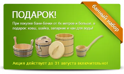 Купив у нас баню-бочку вам уже не нужно думать о тазиках и ковшиках, мы подготовили всё необходимое, чтобы вы могли в первый же день установки воспользоваться своей банькой! До 31 августа, при покупке бани-бочки от 4х метров и больше, в подарок: ковш, шайка, запарник и чан для воды!