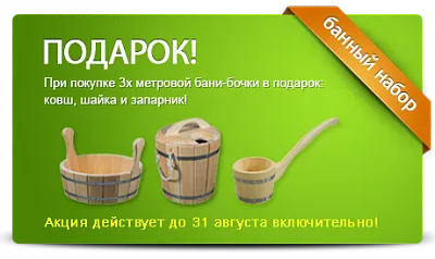 • Акция действует на все изделия из дерева, кроме бань-бочек, бондарной продукции, офуро, душевых кабин и мебели.