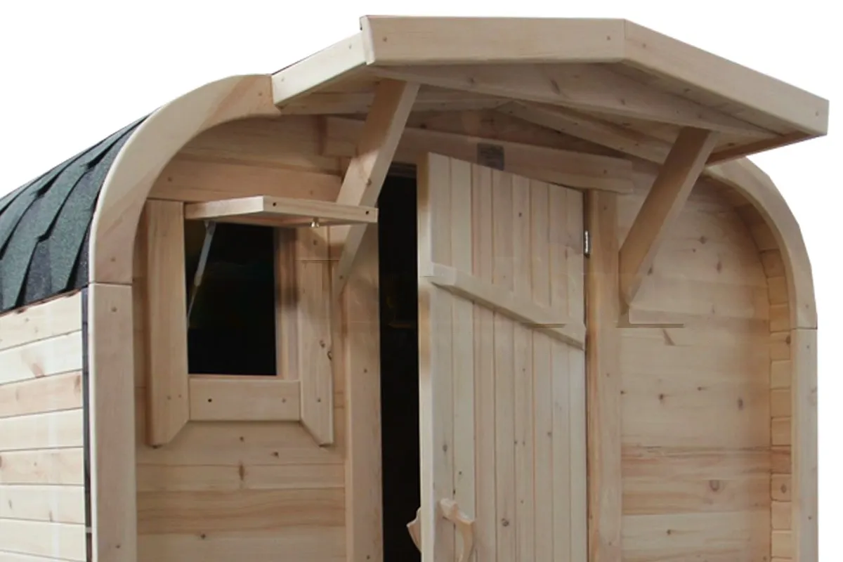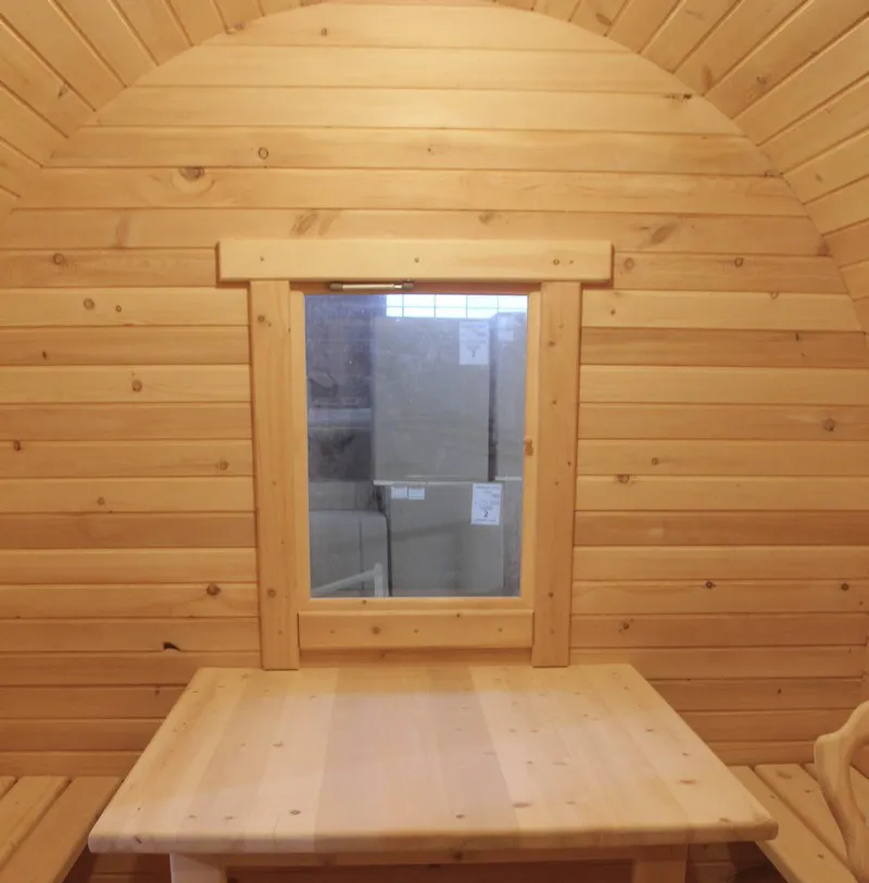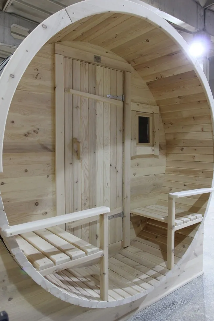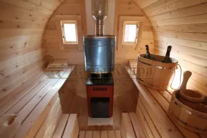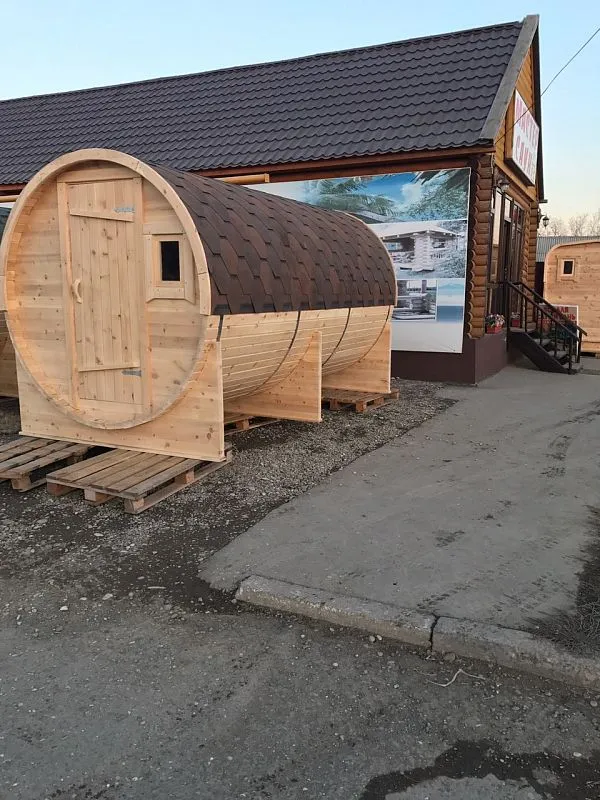 Это изделие круглой вытянутой формы с тремя отделениями: раздевалкой, моечной и парной. Во всех трех отделениях с обеих сторон установлены лавочки из кедра. Печь находится в парилке около дальней стены. Для удобства пользования в бане висят полочки из кедра и вешалка в раздевалке. Время растопки такой бани не превышает 30 минут. По вашему желанию баню-бочку можно дополнить печью с внешней загрузкой, благодаря которой весь мусор после топки останется на улице. Круглая баня-бочка не требует полноценный фундамент, поэтому при необходимости ее можно перенести в другое место.
