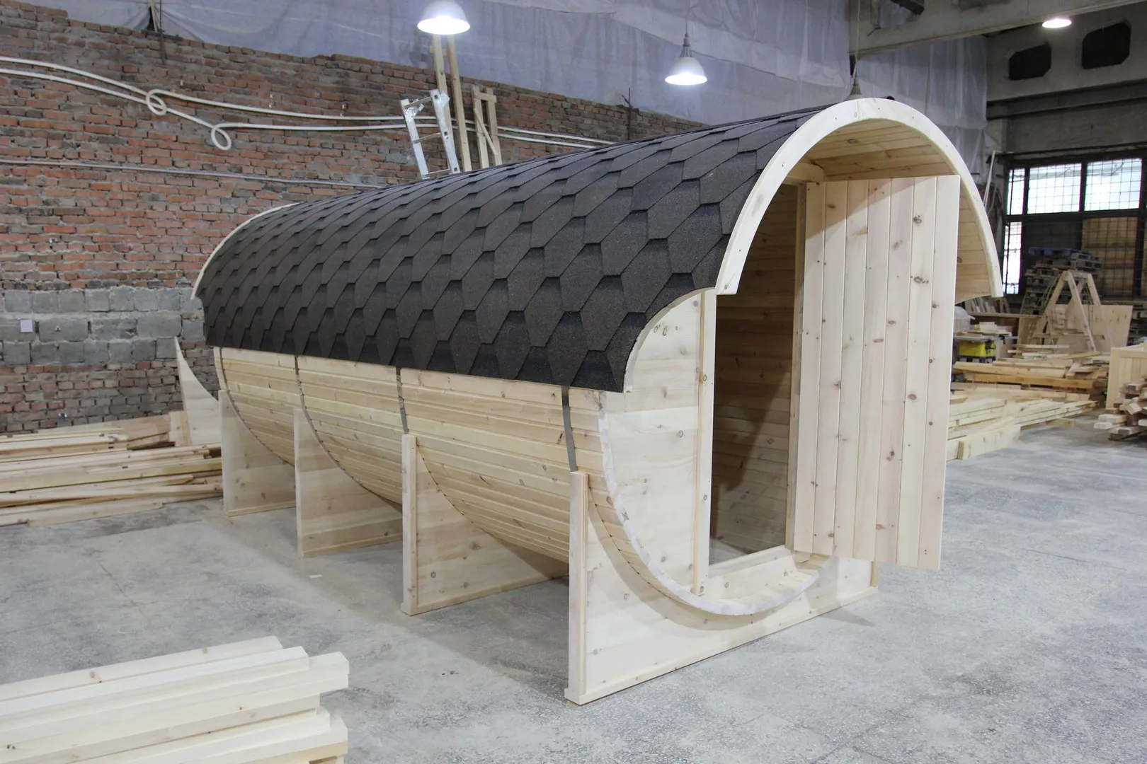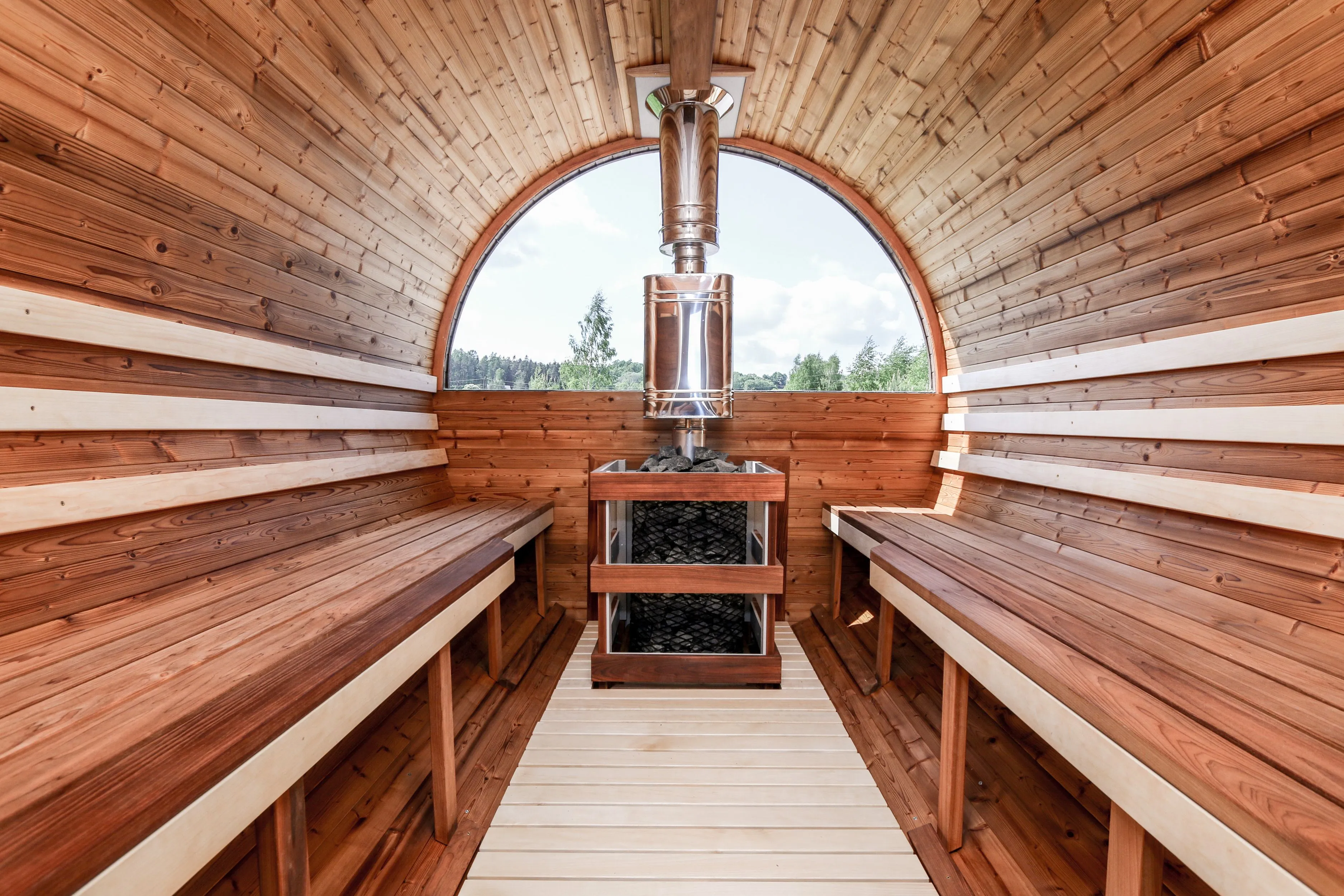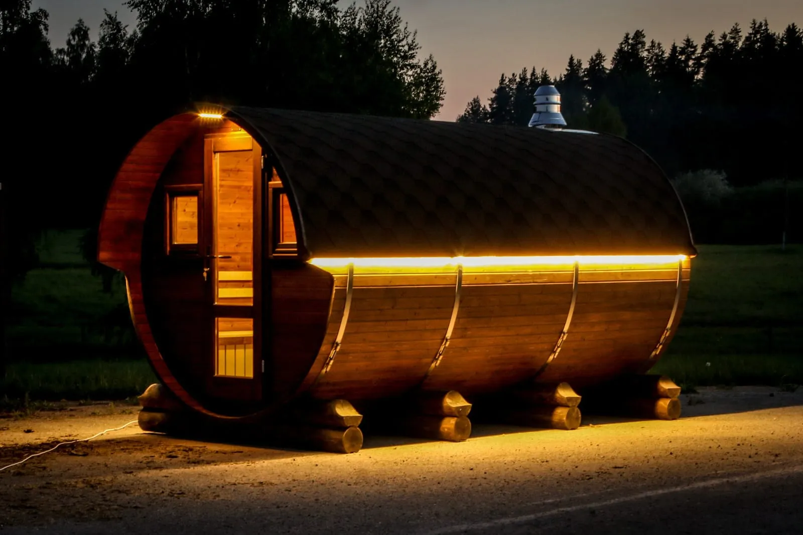 Это изделие круглой вытянутой формы с тремя отделениями: раздевалкой, моечной и парной. Во всех трех отделениях с обеих сторон установлены лавочки из кедра. Печь находится в парилке около дальней стены. Для удобства пользования в бане висят полочки из кедра и вешалка в раздевалке. Время растопки такой бани не превышает 30 минут. По вашему желанию баню-бочку можно дополнить печью с внешней загрузкой, благодаря которой весь мусор после топки останется на улице. Круглая баня-бочка не требует полноценный фундамент, поэтому при необходимости ее можно перенести в другое место.
