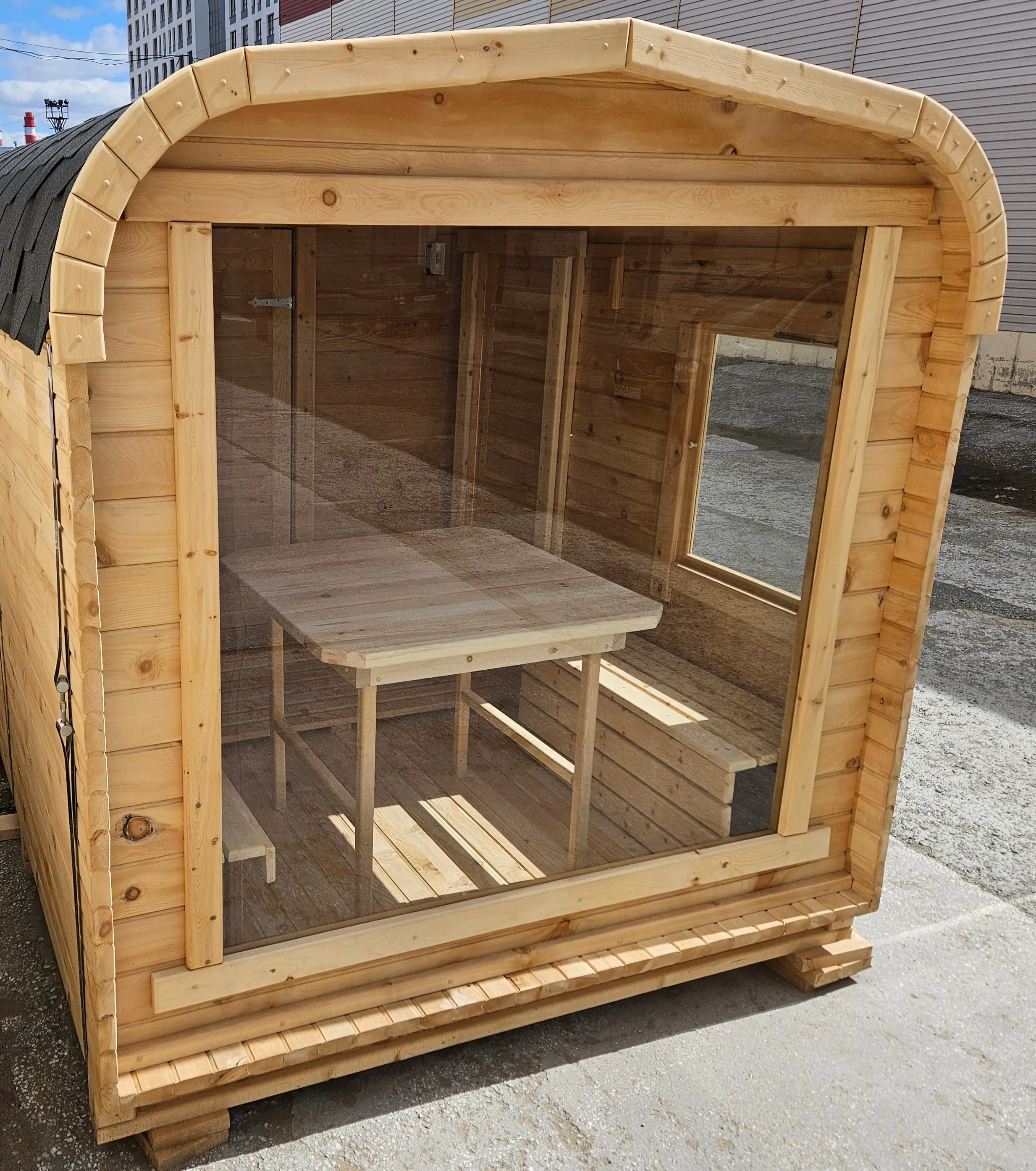 Это прямоугольное изделие с закругленными углами. За счет такой конструкции во время топки воздух циркулирует по кругу, поэтому баня-бочка нагревается не более 30 минут. Козырек не только украшает баню, но и защищает оставленную обувь от дождя. Лавочки из кедра находятся по всей длине бани-бочки с обеих сторон. Печь расположена в парилке около дальней стены. В зависимости от выбранного размера баня-бочка квадро с козырьком имеет следующую комплектацию: