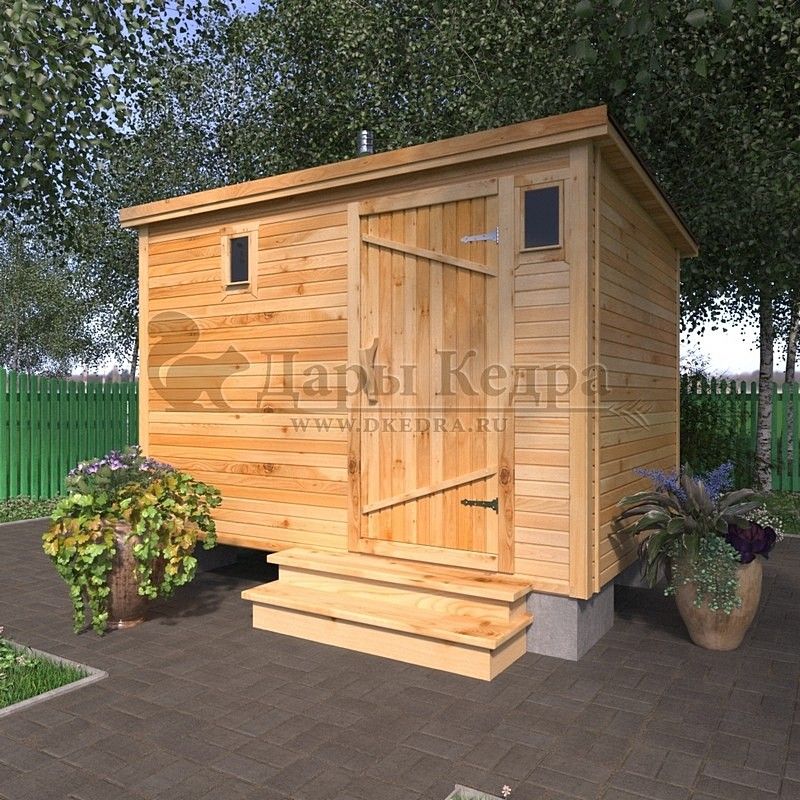 Это классическая прямоугольная модель бани с двумя отделениями: парилкой и раздевалкой. Для удобства пользования раздевалка оснащена лавочкой и вешалкой. Парилка оборудована двухуровневым открытым полком и печью. За счет небольшой конструкции баня нагревается в течении 30 минут. Ее можно заказать как в готовом, так и в разборном варианте. В разборной модели готовые щиты из кедра быстро собираются в полноценное строение, что также позволяет исключить лишний строительный мусор. Каркасно-щитовая баня не требует полноценный фундамент, поэтому при необходимости ее можно перенести в другое место.