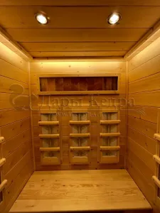 Это специально оборудованная кедровая кабина для прогрева тела человека сухим теплом. Воздух в таких парных не нагревается. Инфракрасные лучи воздействуют на тело, равномерно прогревая мышцы, суставы и органы. Керамические излучатели похожи на лампы, имеют высокую температуру нагрева, поэтому защищены противоожоговыми решетками. Тело человека в таких саунах нагревается интенсивнее. Работает кабина за счет электричества. Двухместная инфракрасная сауна с керамическими излучателями подойдет как для домашнего использования, так и для коммерции.