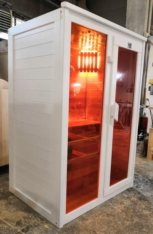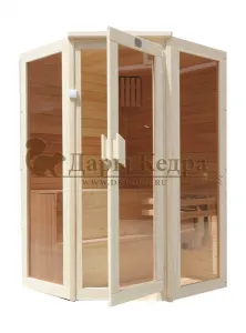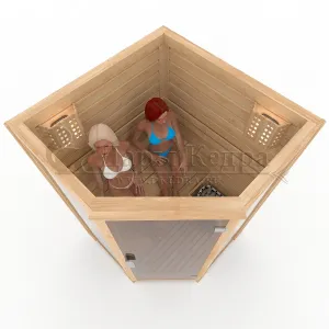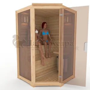 Это специально оборудованная деревянная кабина для сухого и влажного парения. Электропечь нагревает пространство внутри и позволяет сбрызгивать камни водой, слегка увлажняя воздух. Такая процедура позволяет избежать перегрева. Сауна обшита снаружи и внутри вагонкой из липы и имеет теплоизоляционный слой. Установка сауны в угол позволяет рационально использовать пространство помещения. Финская сауна с электропечью подойдет как для домашнего использования, так и для коммерции. Доставляется в разборном виде щитами, собирается по инструкции с помощью шуруповёрта.