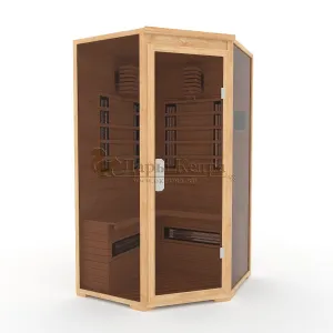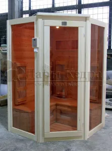 Это специально оборудованная кедровая кабина для прогрева тела человека сухим теплом. Воздух в таких парных не нагревается. Инфракрасные лучи воздействуют на тело, равномерно прогревая мышцы, суставы и органы. Керамические излучатели похожи на лампы, имеют высокую температуру нагрева, поэтому защищены противоожоговыми решетками. Тело человека в таких саунах нагревается интенсивнее. Работает кабина за счет электричества. Установка сауны в угол, позволяет рационально использовать пространство помещения. Подходит как для домашнего использования, так и для коммерции.