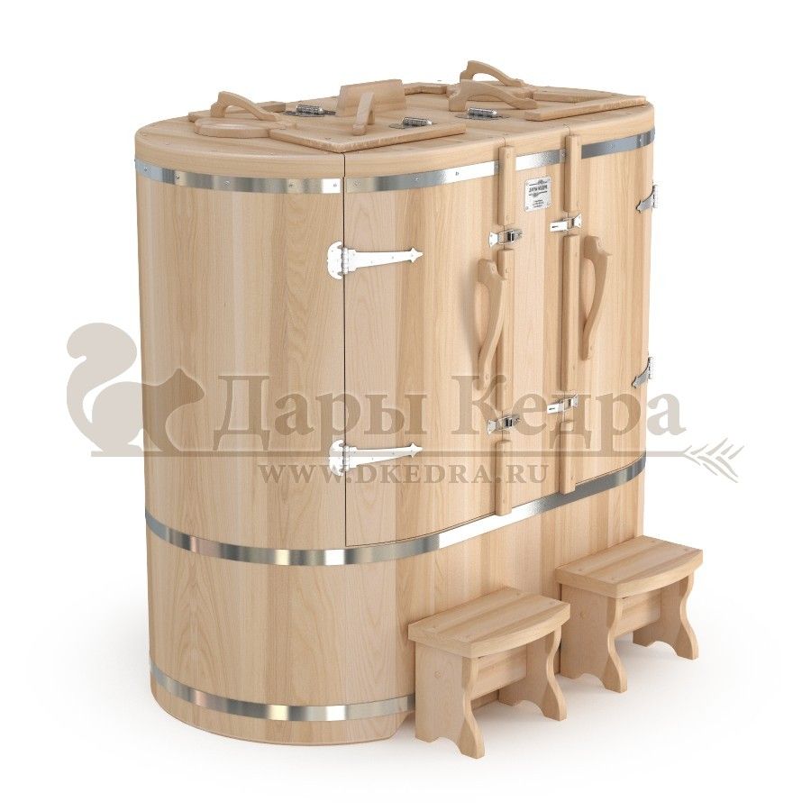Двухместная фитобочка из кедра - это парная, в которой удобно принимать процедуры двум людям. Она оборудована откидными створками, дверцей, отверстием для головы и перегородкой (по желанию). Толщина стенок составляет 40-45 мм, что позволяет увеличить срок службы изделия. Во время парения человек находится внутри кедровой бочки, а голова снаружи. Благодаря этому исключается возможность перегрева. Подлокотники из кедра и внутренние ручки делают эксплуатацию фитобочки более удобной.